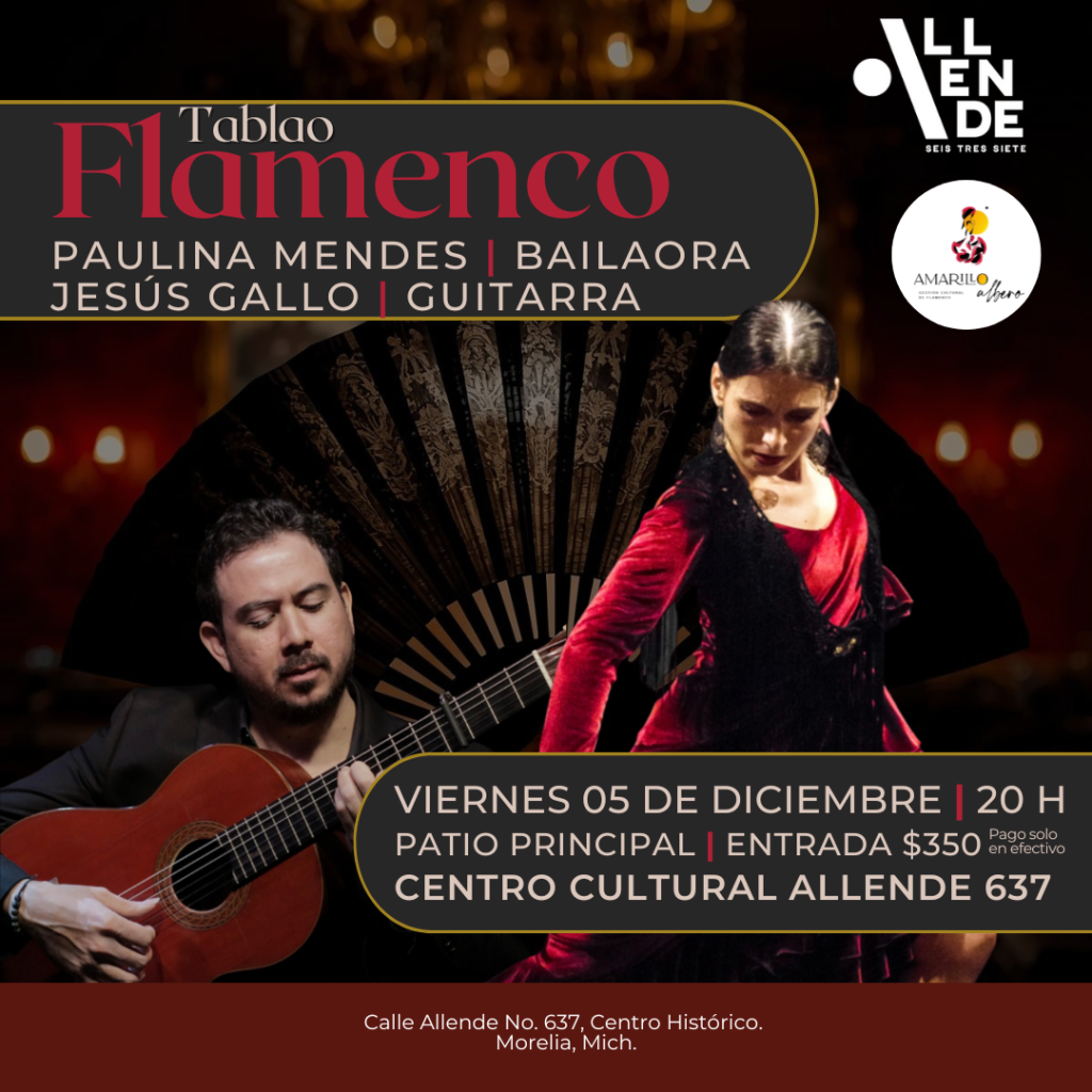 Asiste al último tablao del año que tendremos en el Centro Cultural Allende 637, donde el arte y la pasión se encuentran en un escenario lleno de vida y emoción. Te invitamos a unirte a nosotros para experimentar la magia del flamenco en su máxima expresión. Paulina Mendes en el baile y en la guitarra, Jesús Gallo, te harán vibrar con cada taconeo y cada rasgueo de guitarra.