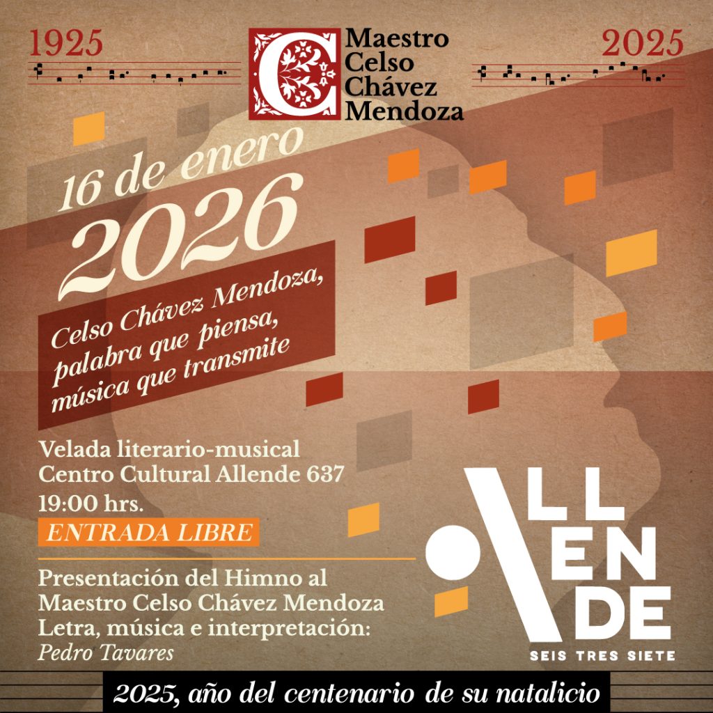Velada Literario-Musical en Allende 637, Celso Chávez Mendoza. Palabra que piensa, música que transmite. El Centro Cultural Allende 637 se honra en presentar la Velada Literario-Musical con la que se dará cierre al Centenario del natalicio del maestro Celso Chávez Mendoza (1925–2006), figura fundamental de la vida musical y cultural de Morelia y de Michoacán. Esta velada propone un acercamiento a una de las facetas quizá menos conocidas, pero de gran riqueza y profundidad del maestro Celso: su obra literaria. A través de la lectura de textos poéticos, piezas de humor fino, reflexiones en verso y relatos de ingenio, intercalados con la interpretación de obras musicales significativas de su autoría, el público podrá descubrir al hombre de palabra lúcida, sensible y profundamente humano. Te invitamos a ser parte de esta actividad que contribuye a la preservación, difusión y celebración de la memoria cultural de nuestra ciudad y con la que culmina las actividades por el centenario del aniversario del natalicio del maestro Celso Chávez Mendoza.
