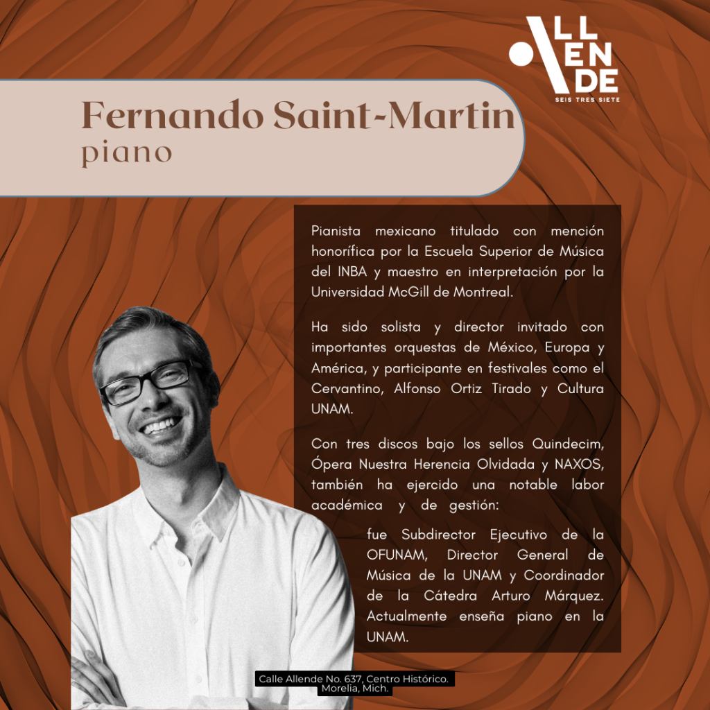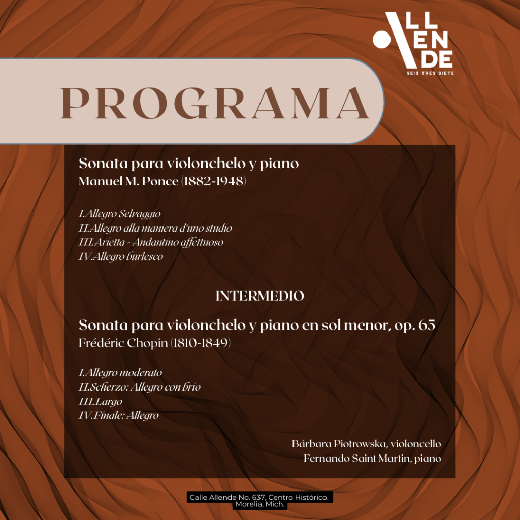 No te pierdas el recital de piano y violoncello y vive una experiencia musical única y envolvente. Fernando Saint-Martin y Bárbara Piotrowska, nos brindarán una interpretación llena de emoción y virtuosismo con la música de Manuel M. Ponce y Frédéric Chopin.