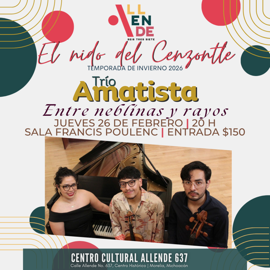El Trío Amatista presenta Entre neblinas y rayos, un programa vibrante que entrelaza dos universos sonoros: la intensidad expresiva de Beethoven -los rayos- y la sutileza atmosférica de Debussy -la neblina-. A través de esta selección, se busca mostrar no sólo el contraste entre dos épocas y lenguajes musicales, sino también la energía, el carácter y la sensibilidad interpretativa que les definen como ensamble.
