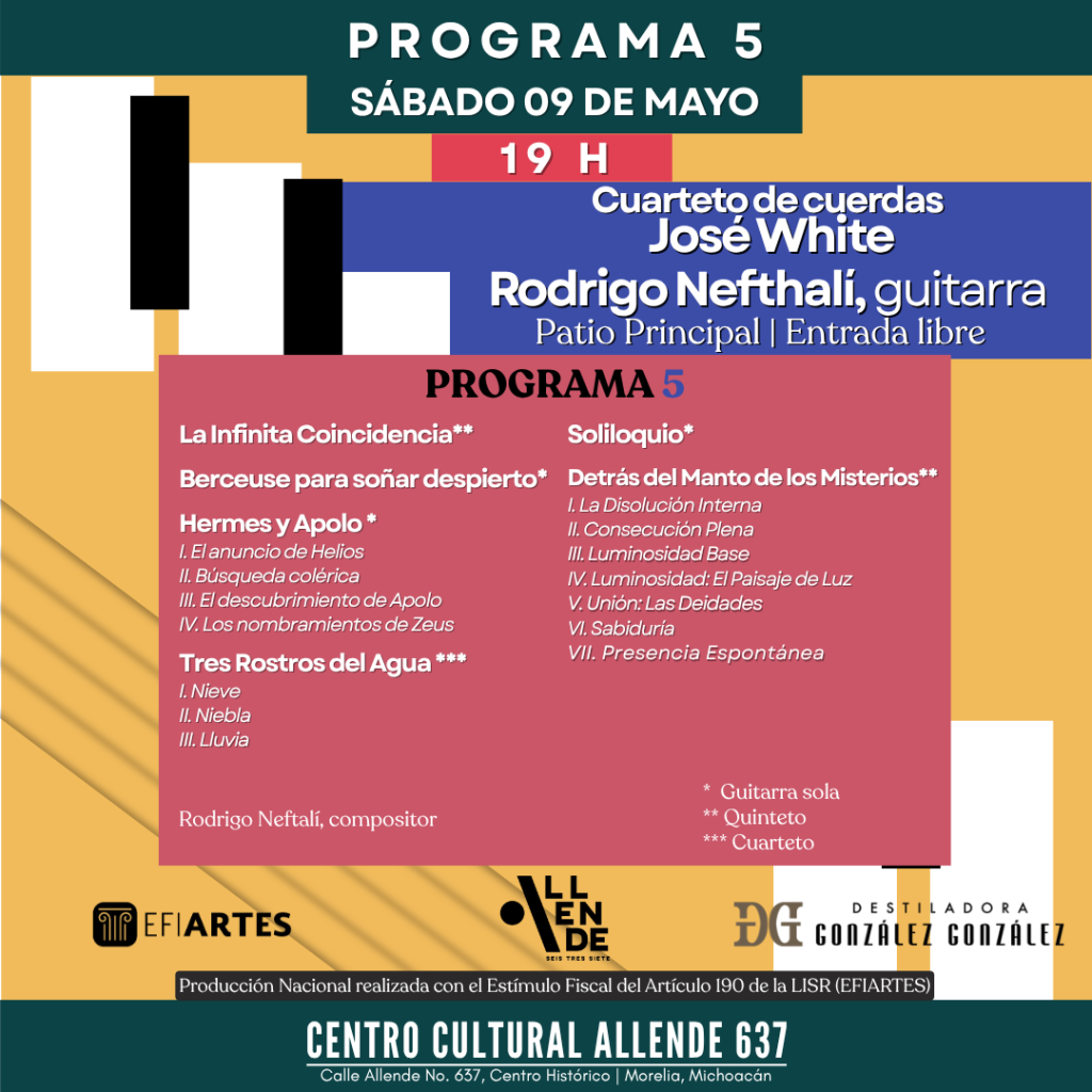Nos acompañan el virtuosismo de Rodrigo Nefthalí en la guitarra y la impecable trayectoria del Cuarteto de Cuerdas José White. Una velada diseñada para quienes buscan refugiarse en la belleza de la música, con composiciones de la autoría del maestro Rodrigo Nefthalí.